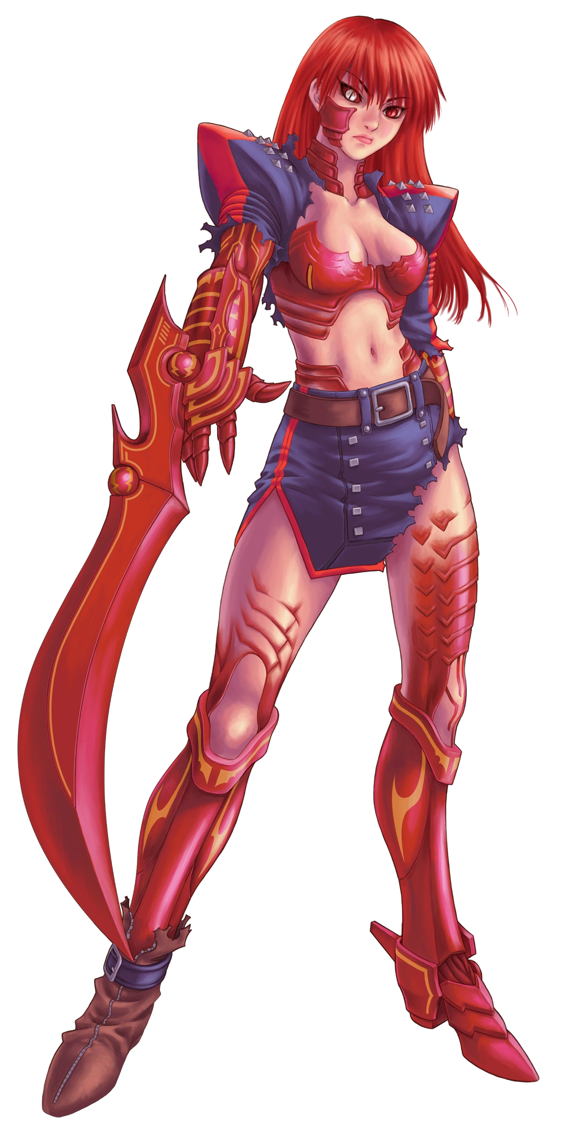 In her beast form, the Spurious, she kind of maintains a human appearance. Her hair becomes red like her right eye. It seems that an exoskeleton appears on her right cheek, her torso (covering her breast), her arms, and the lower half of her legs giving her a futuristic aspect. But the most prominent change in her transformation it's her right arm fully covered by the exoskeleton and complemented by a red blade. In biological terms, Spurious means a structure that has a comparable appearance but nonetheless has a diverse structure. This identifies what she shares similar physical traits in her Beast Form with Xion the Unborn.
