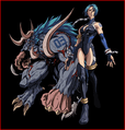 Her beast form resembles a towering monster with features lightly inspired by the mythological Chimera, as you can notice a mix between a snake, a lion (her two tails) and a goat (her horns). Her fur in this form is teal, and possesses giant horns around her shoulders. Unlike other female fighters, she lacks her breasts in her beast form. She has a tattoo of "03" on her shoulder that is retained in chimera form.